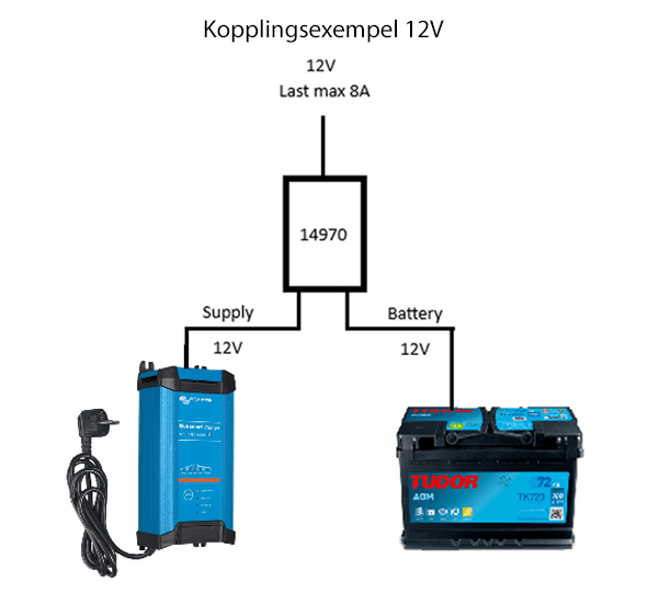 När spänning på proriterad ingång försvinner kopplar switchen direkt över till sekundär spänningsmatning, t.ex.bilbatteriet.