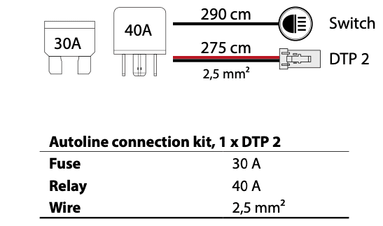 • 40A relä, reläsockel, brytare, säkring och DTP-kontakt ingår