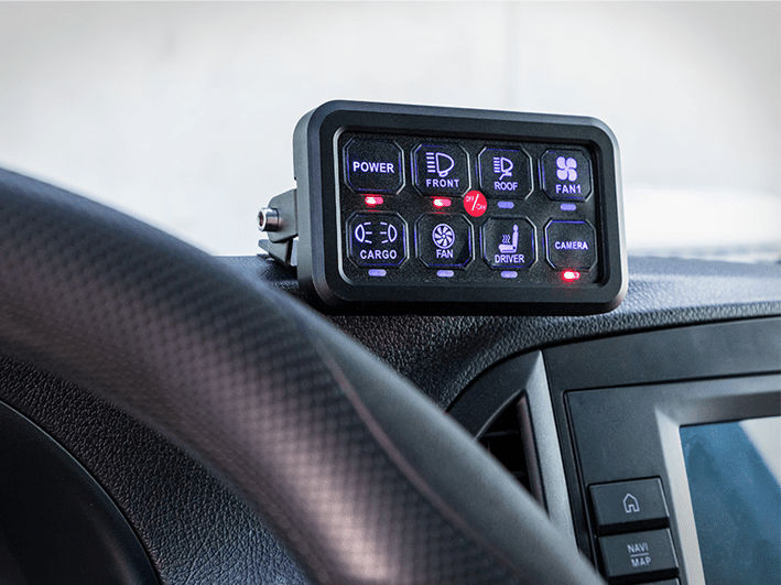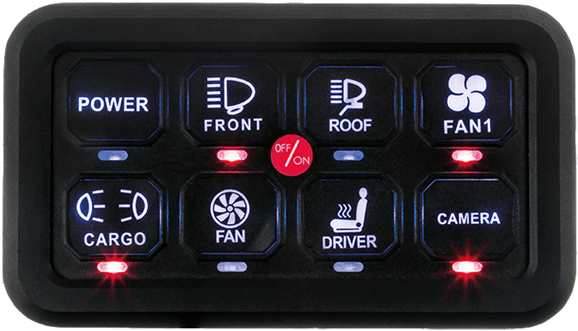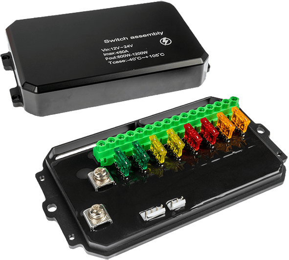 - Kontrollbox med 8 utgångar. (2x30A, 2x20A, 2x10A, 2X5A)