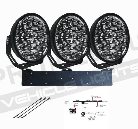 - Vår egna hållare för 3 st 9″ extraljus