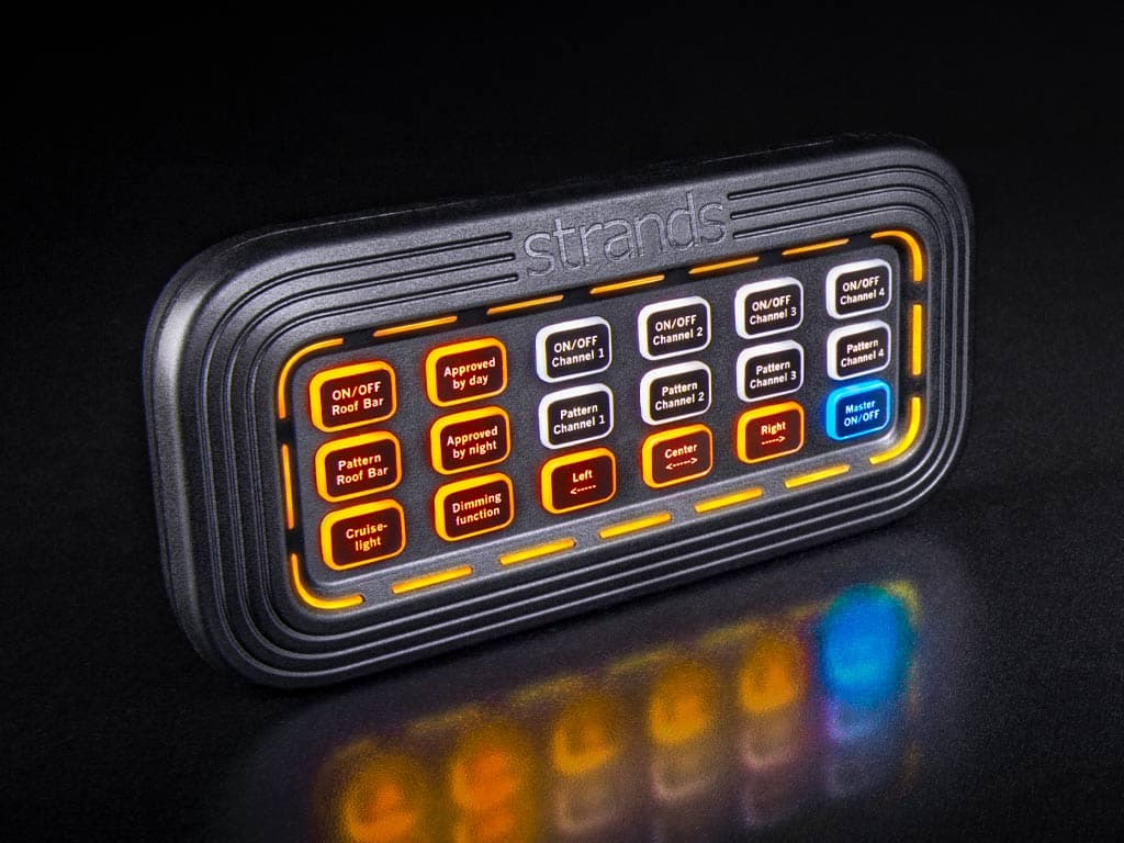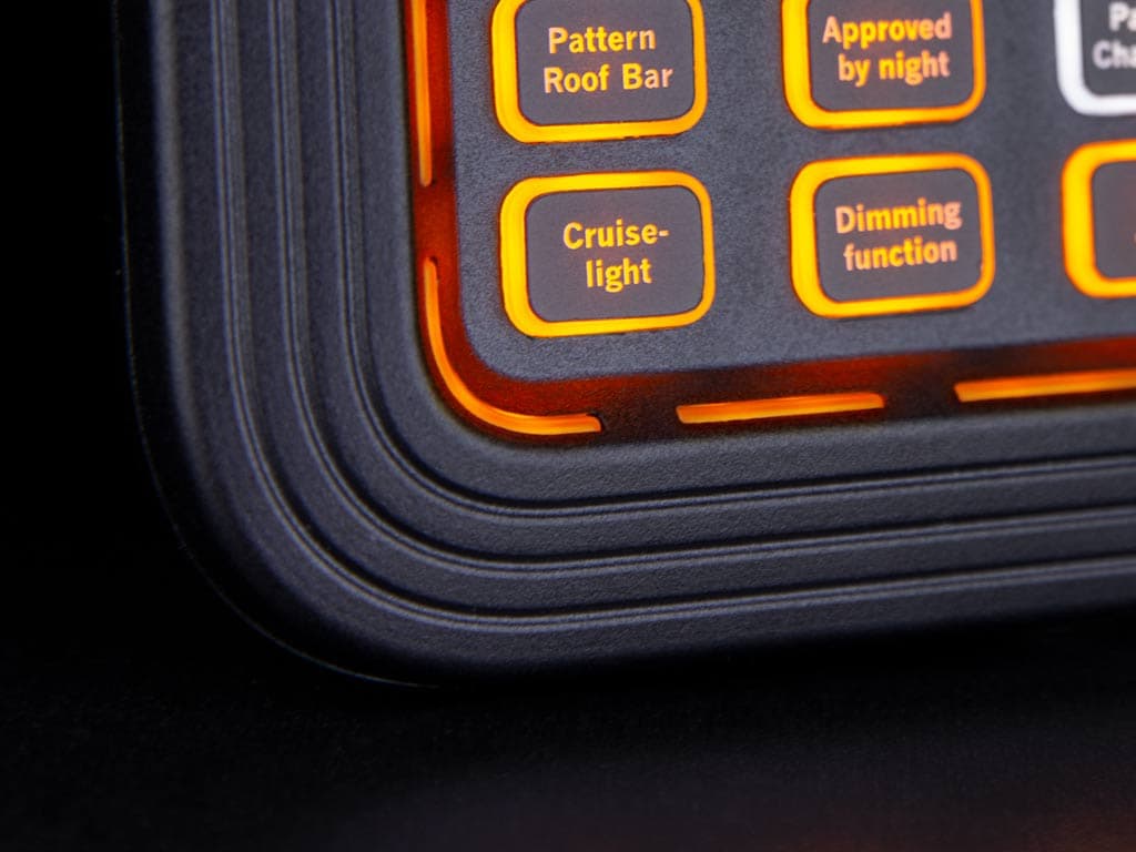 Kontrollboxen är färgkoordinerad. Nio knappar är orangea, åtta är vita och en är blå. De orangea knapparna är dedikerade till Cruise Light blixtljusramper och kan till exempel byta varningsljusmönster. För de flesta funktioner är knapparna highlightade när de används och varningsljusmönstret visas i lysdioderna runt kontrollboxen. Du får också knappar för godkännande av dagsläge, nattläge och Cruise Light-läge.