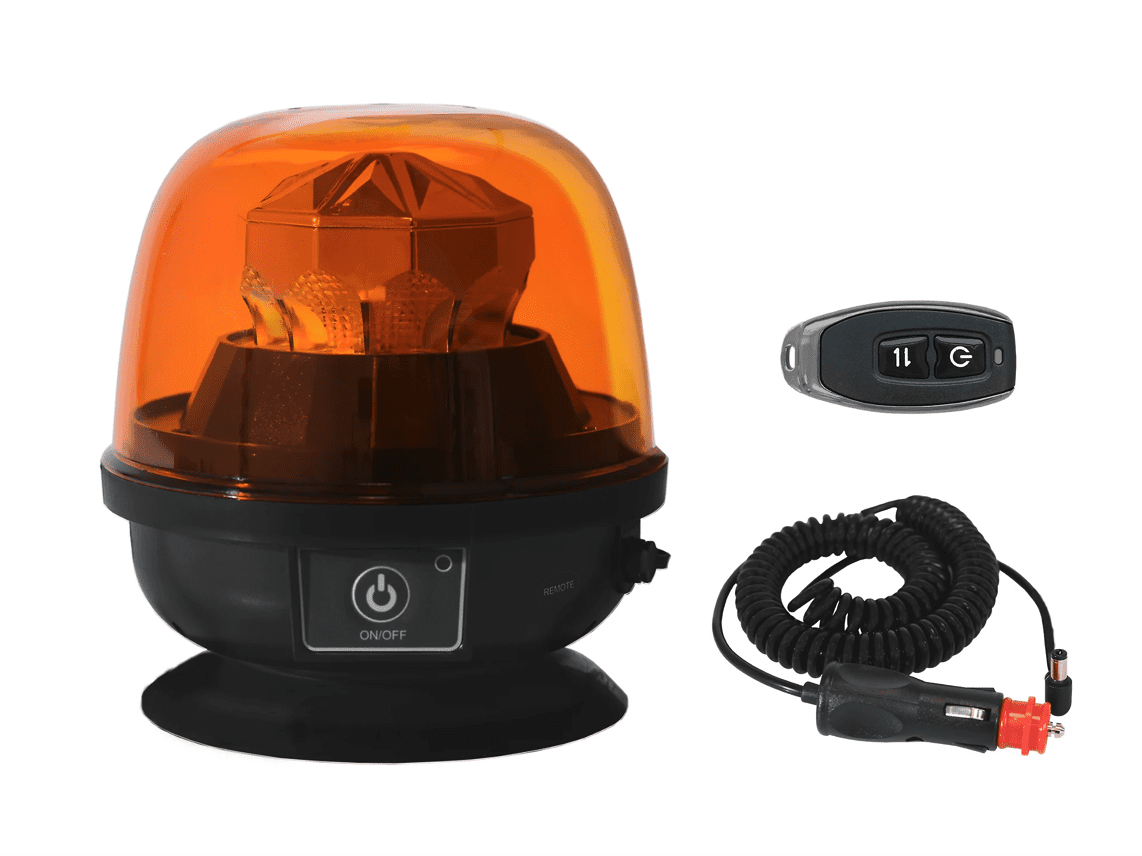 LED roterande varningsljus med magnetfäste. Varningljuset är batteridrivet och aktiveras med en enkel knapptryckning, antingen direkt på varningsljuset eller med hjälp av fjärrkontrollen.