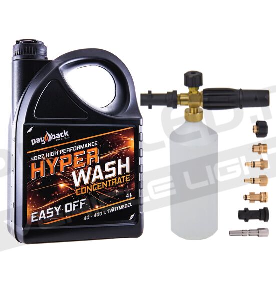 Payback Hyper Wash Ultra Performance – Ett tvättmedel som verkligen kan rengöra! Ett av de effektivaste, alkaliska tvättmedel för fordon och utrustningar! Avlägsnar trafikfilm, smuts, sot, insekter, fett, olja och vägsalt utan beröring, endast avspolning med högtryckstvätt! Den extremt höga tvätteffekten reducerar rengöringstiden och är en av de mest effektiva på världsmarknaden!