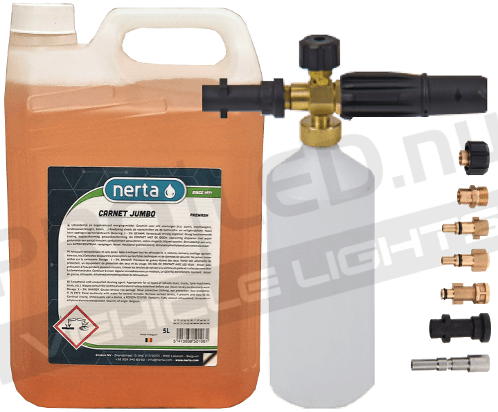 Erbjudande – Foam Gun Snow-X tillsammans med Nerta Carnet Jumbo 5 liter. Passar dom flesta tvättar på marknaden, 7 adaptrar medföljer!