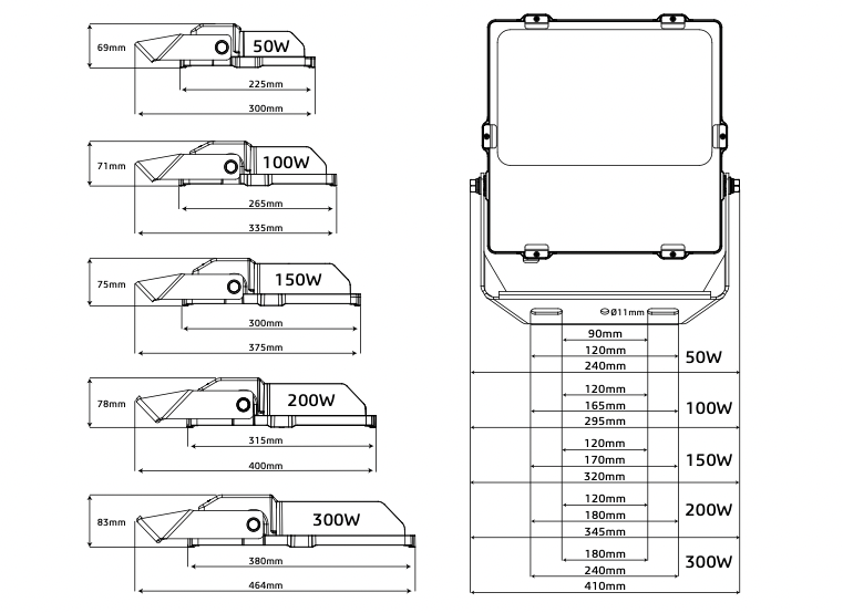 | Watt | 50w, 100w, 150w, 200w, 300w |