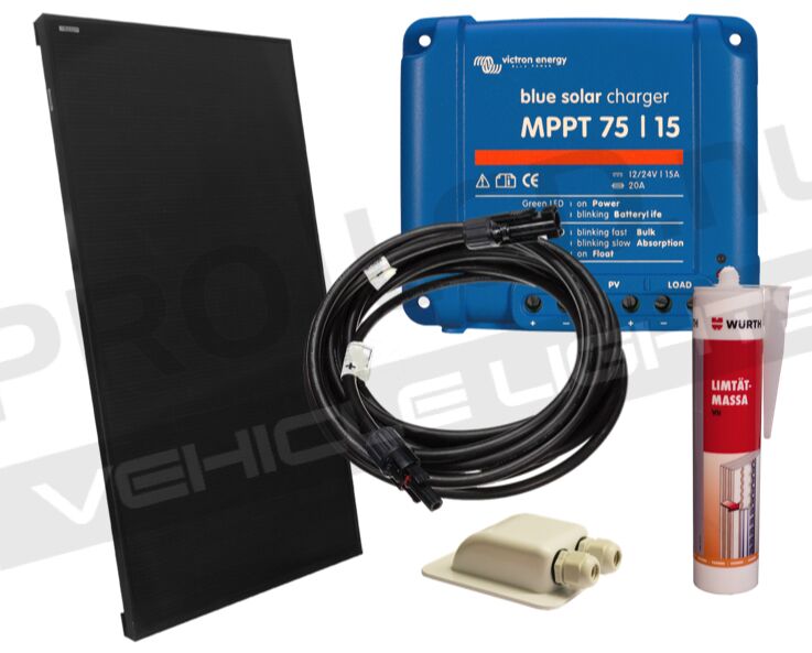 Levereras som kit med solpanel, MPPT spänningsregulator och monteringsmaterial (limfötter, klister och dubbel kabelgenomföring) för enkel och snabb installation.