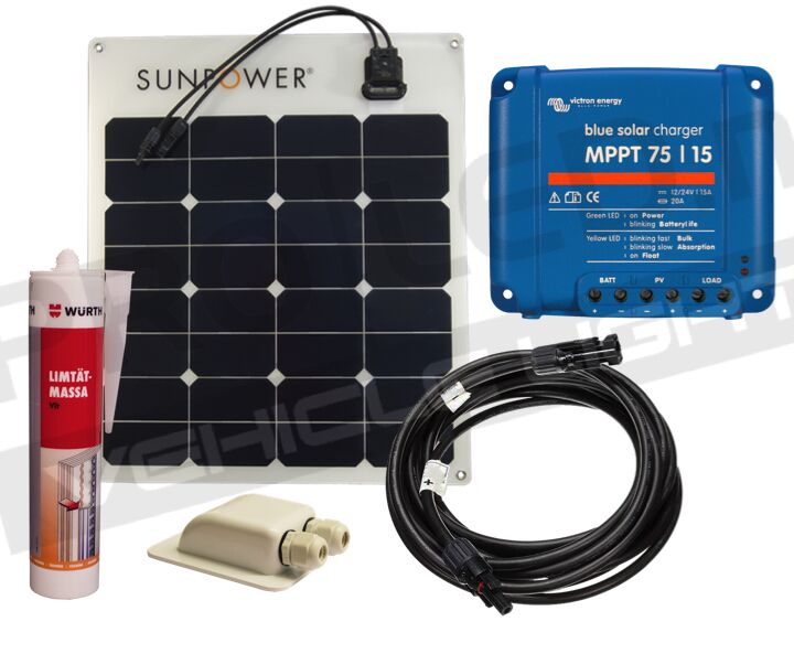 Levereras som kit med solpanel, MPPT spänningsregulator och monteringsmaterial (limfötter, klister och dubbel kabelgenomföring) för enkel och snabb installation.